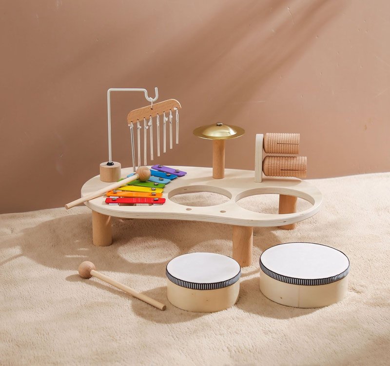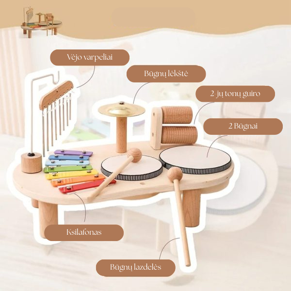 Įvairūs instrumentai: Skatina vaiko pažintį su skirtingais garsais ir ritmais, ugdo klausą. Ksilofonas, būgnai, vėjo varpelis, būgnų lėkštė ir lazdelės, dviejų tonų guiro